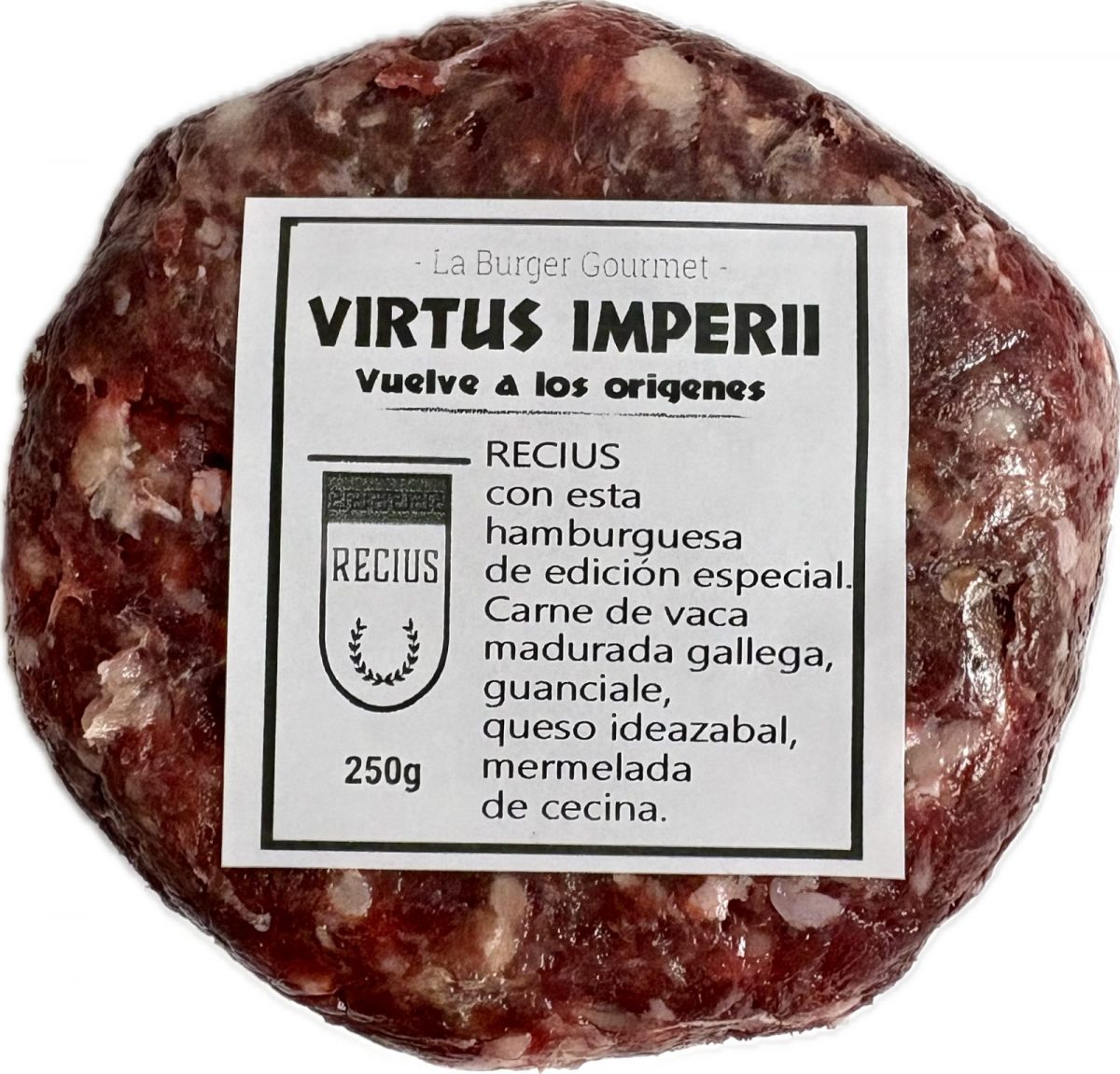 La VIRTUS IMPERII es una creación exclusiva que eleva el concepto de hamburguesa gourmet a un nivel superior. Elaborada con carne de vaca gallega madurada, reconocida por su terneza y sabor intenso, y enriquecida con ingredientes de tradición y carácter.